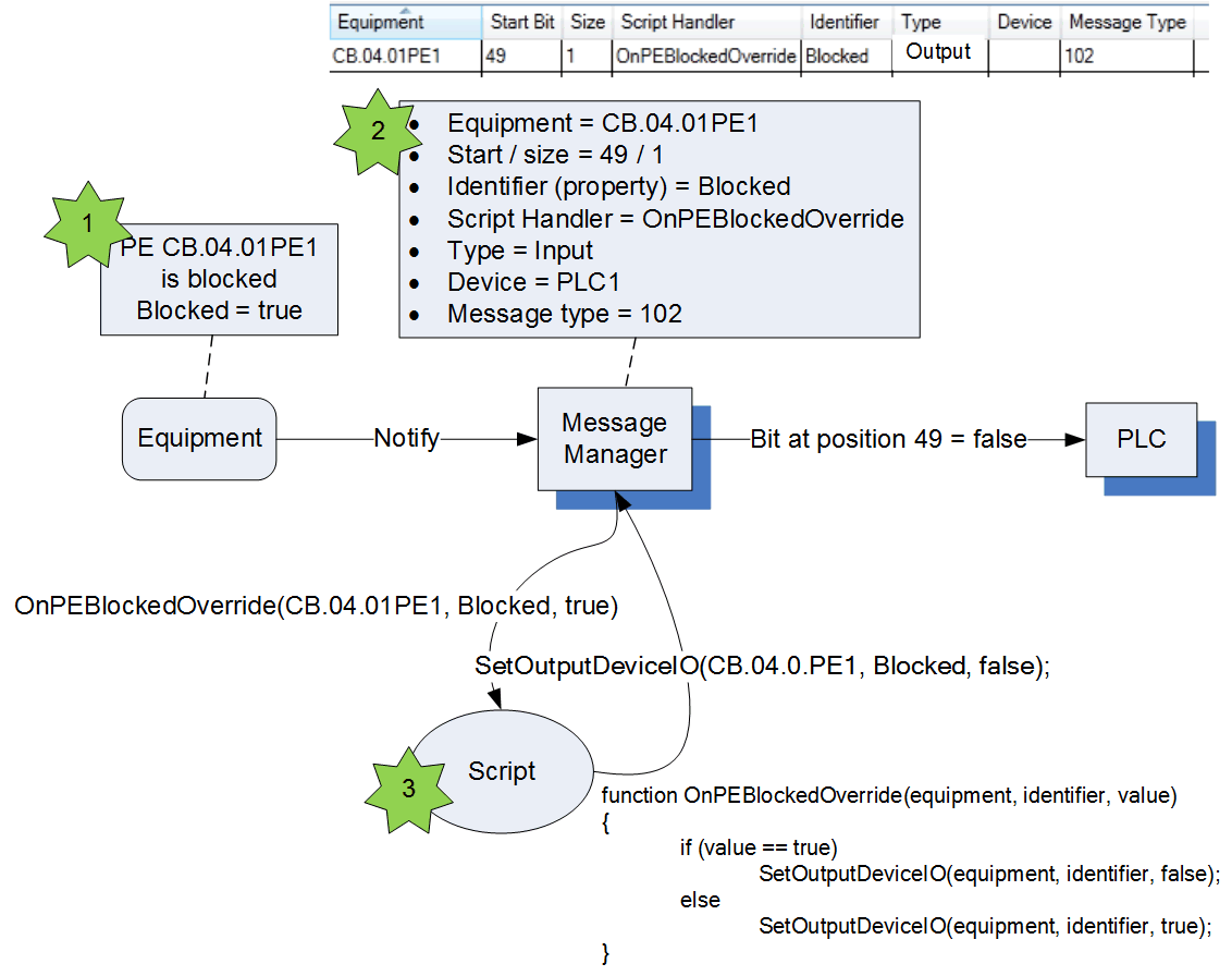 A small script handler converts the equipment property to outputs. This could typically be used to invert the value of a PE sensor blocked/unblocked values.